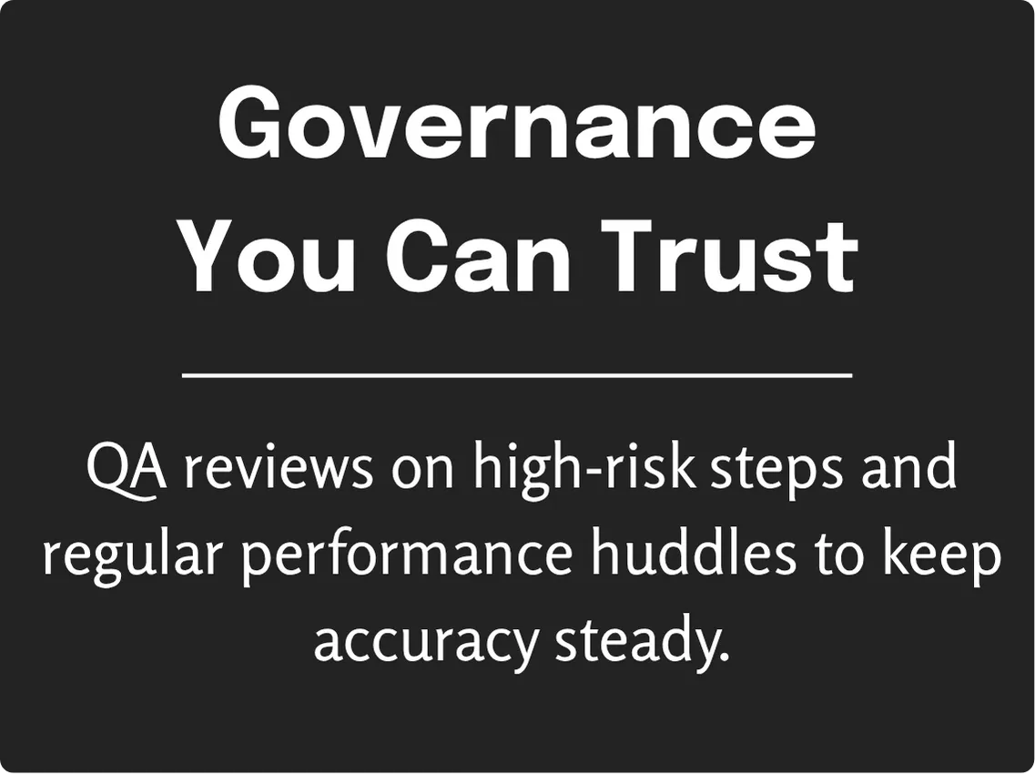 Layered QA on high-risk steps, defined SLAs for turnaround, and simple status reporting. Exceptions show up early, not at month end.