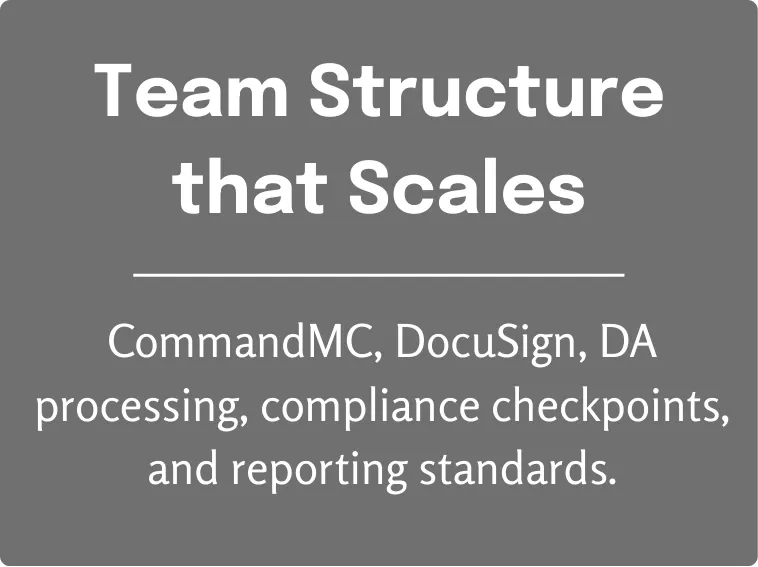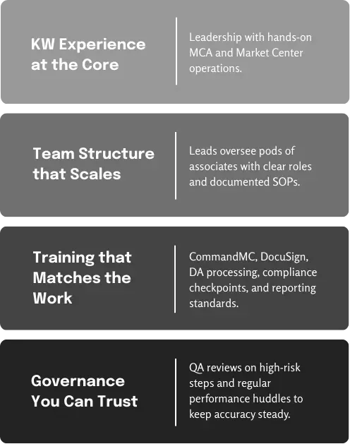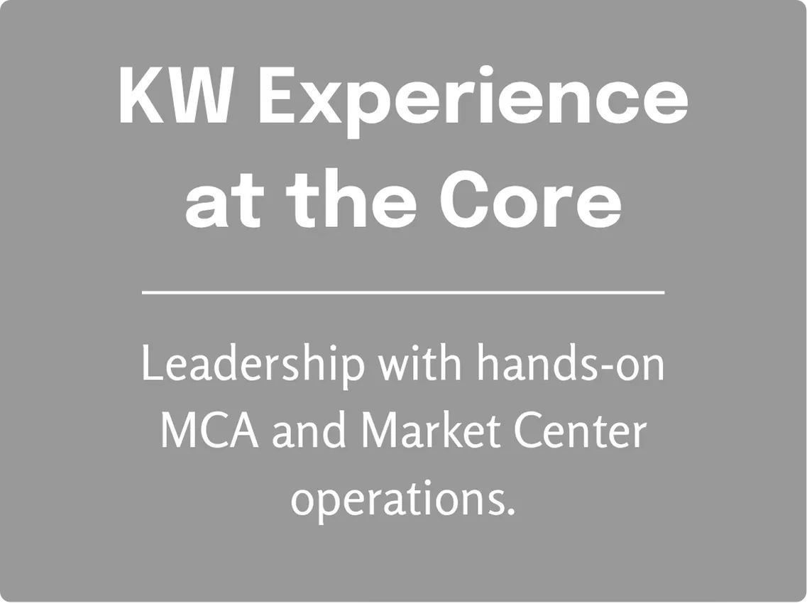 We come from the Keller Williams world. Our leadership and team leads understand MCA realities, compliance rhythms, and month end pressures.