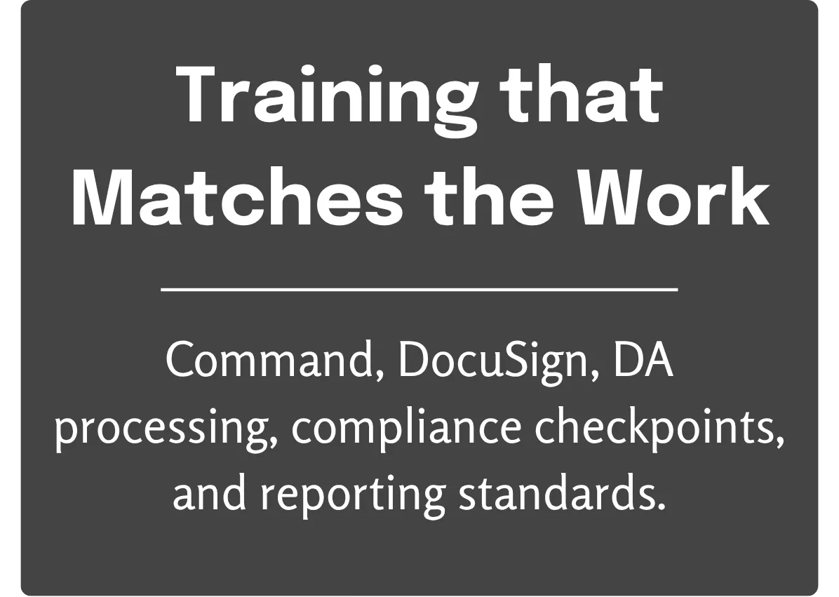 Command, Command MC, Keller Cloud, KWLS, DocuSign, DA processing and Compliance. Our checklists follow MCA models and KW standards so there’s no guesswork.